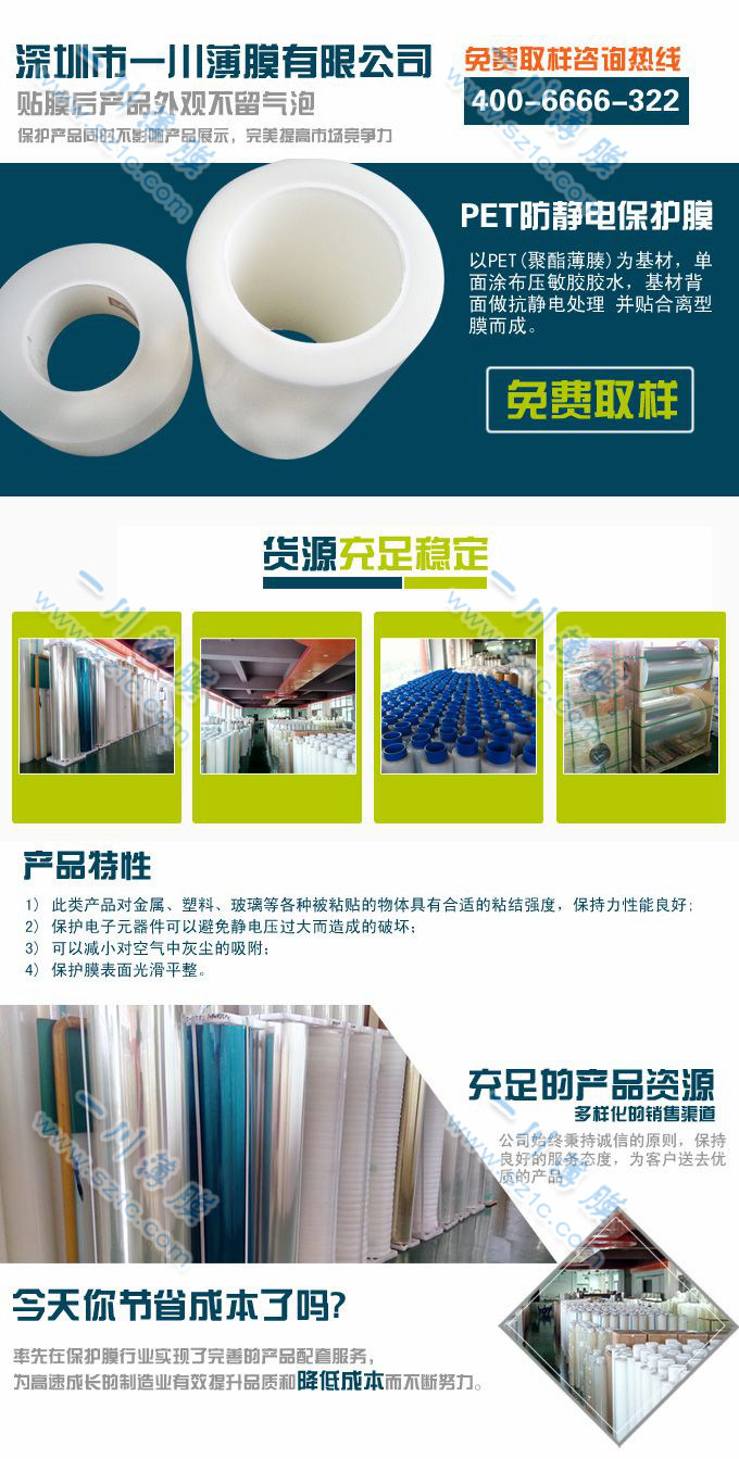 耐高溫防靜電保護膜,PET基材,涂布防靜電液而成,可有效減少靜電對電子產品的傷害,短時間耐溫100℃以上。