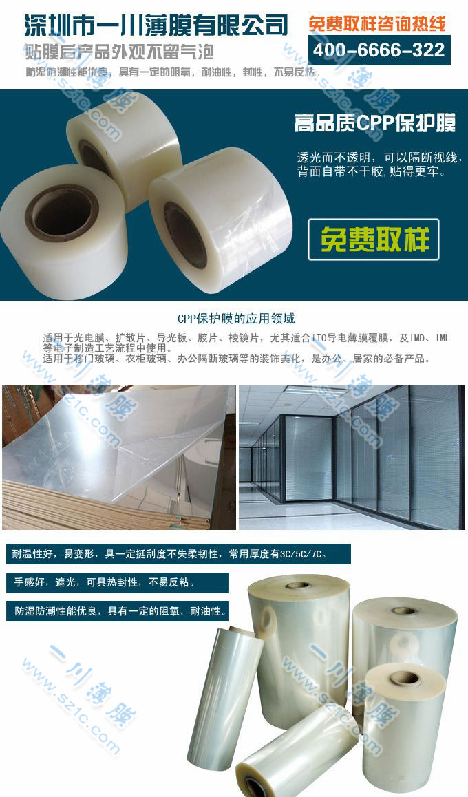 CPP保護(hù)膜是以CPP為基材,單面涂布壓克力膠水收卷而成。