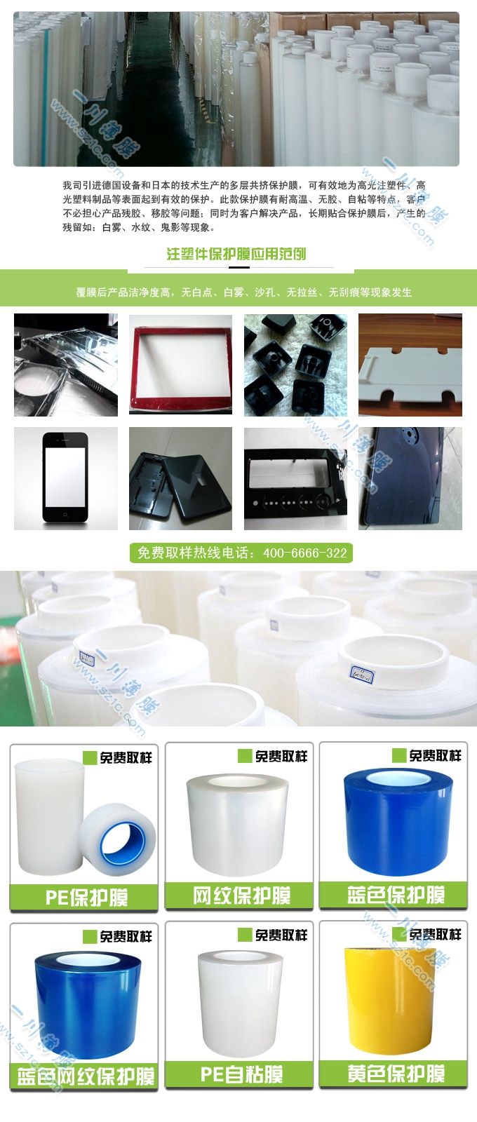 塑膠后蓋高溫保護,高光注塑件,塑料板材面材保護膜,塑膠盒保護膜我司引進德國設備和日本的技術生產(chǎn)的多層共擠保護膜,可有效地為高光注塑件、高光塑料制品等表面起到有效的保護。此款保護膜有耐高溫、無膠、自粘等特點,客戶不必擔心產(chǎn)品殘膠、移膠等問題;同時為客戶解決,產(chǎn)品長期貼合保護膜后,產(chǎn)生的殘留如:白霧、水紋、鬼影等現(xiàn)象。